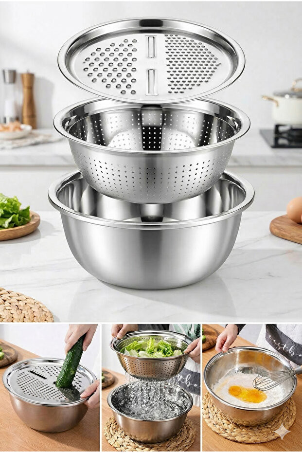 3'lü Set Çok Fonksiyonlu Paslanmaz Çelik Rende, Süzgeç ve Kase Seti