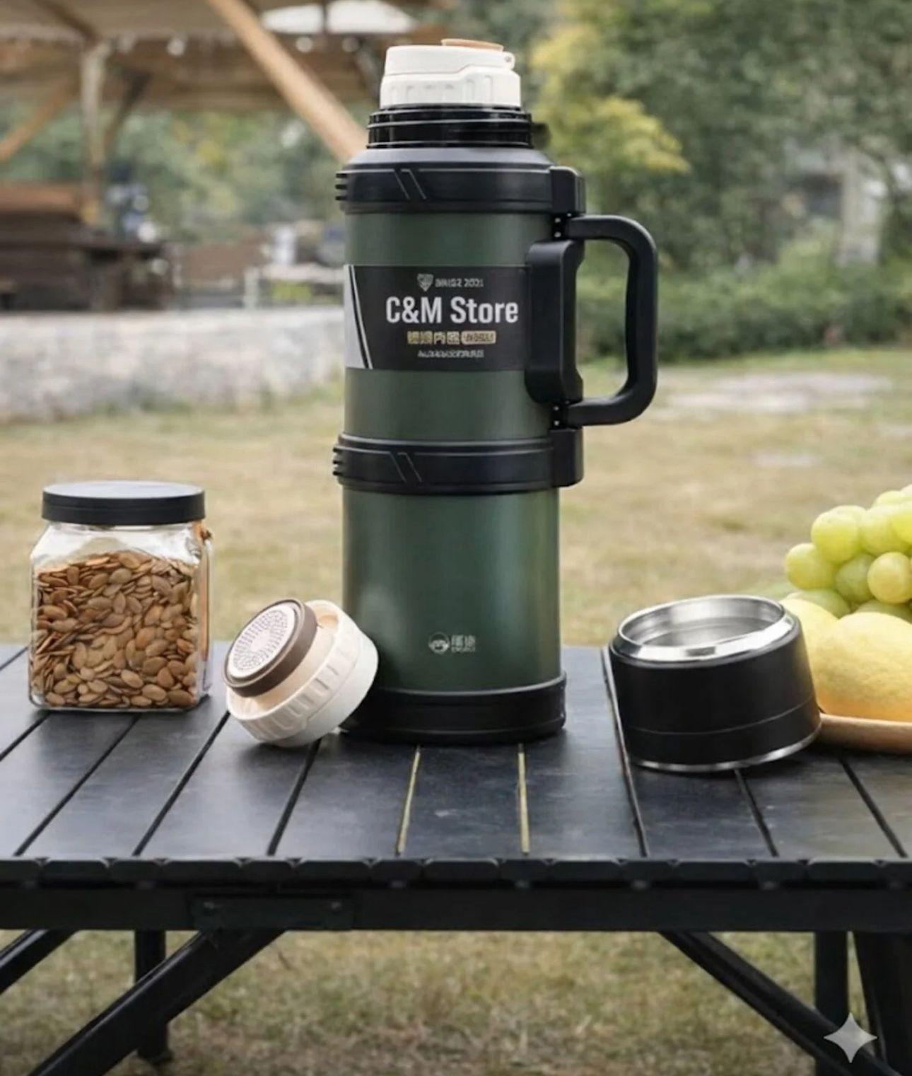 Güçlü tasarımı ve yüksek performansıyla öne çıkan bu büyük hacimli termos, outdoor aktiviteleriniz ve günlük kullanımınız için ideal bir çözümdür. Kamp, piknik, seyahat ya da iş yerinde uzun süreli sıcak veya soğuk içecek ihtiyacınızı kolayca karşılar.Çift katmanlı yalıtım teknolojisi sayesinde içeceklerinizi saatlerce ilk günkü sıcaklıkta korur. Dayanıklı dış yüzeyi darbelere karşı ekstra direnç sağlarken, ergonomik sapı rahat taşıma ve kullanım imkânı sunar. Geniş ağız yapısı kolay dolum ve temizlik avantajı sağlar.Sızdırmaz kapak sistemi ile güvenli kullanım sunan termos, aynı zamanda bardak olarak kullanılabilen kapak tasarımıyla pratiklik sağlar. Modern ve sportif görünümüyle hem doğada hem şehir hayatında şıklığınızdan ödün vermez.