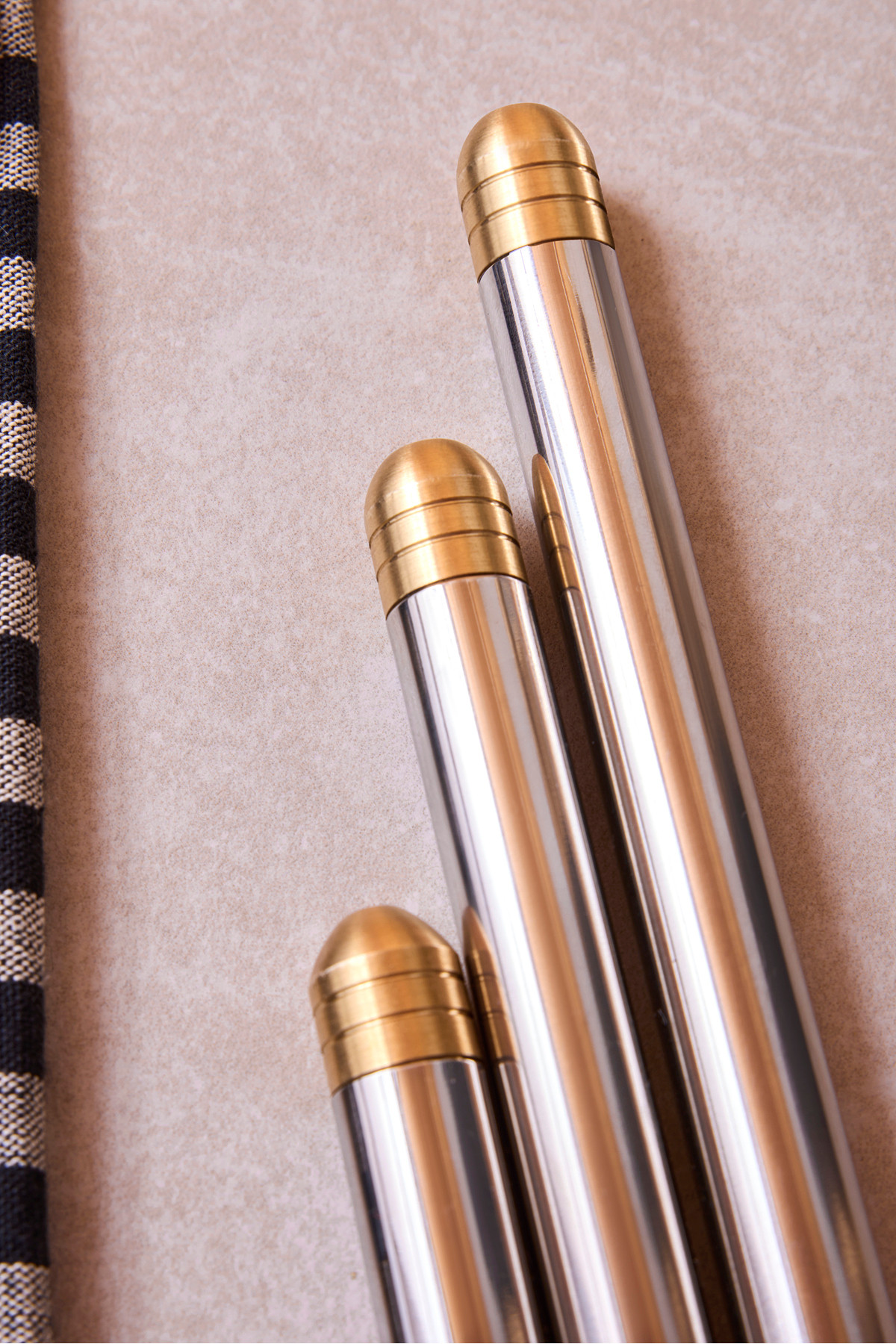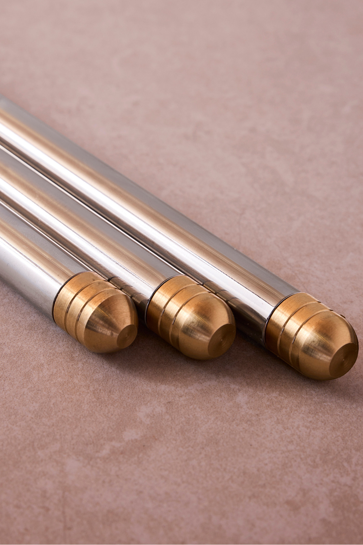 Modern tasarımı ve kaliteli malzemesiyle öne çıkan bu metal çubuklar, hem estetik hem de fonksiyonelliği bir arada sunar. Parlak yüzey kaplaması ve altın tonlu uç detayları sayesinde bulunduğu ortama sofistike bir dokunuş katar.